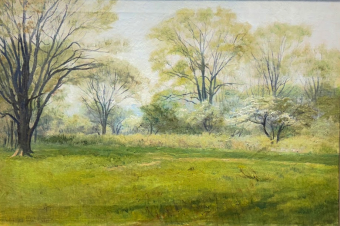 Among the European circle, two artists in our collection demonstrate the diverse directions Duveneck’s instruction could inspire. Charles Abel Corwin (1857–1938) became a central figure in Chicago’s artistic life, transmitting Munich-trained tonal painting to a rapidly developing Midwestern cultural center. His landscape Hawthorne and Willow (c. 1899) reflects this mature synthesis. A luminous meadow dissolves into softly articulated trees, organized through tonal harmony rather than linear detail. The restrained palette of greens, pale blues, and muted earth tones reveals fidelity to Munich methods, while the fluid brushwork anticipates American Impressionism. Corwin transforms an unassuming urban-edge scene into a contemplative landscape shaped by atmosphere and light.